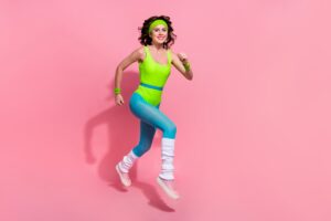 L’idéal féminin se muscle dans les années 80. L’aérobic, popularisé par des figures comme Jane Fonda, met en avant des corps toniques et athlétiques. Les épaules larges et les jambes galbées sont les nouvelles références.